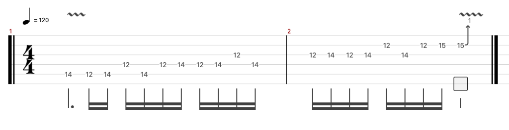 二つ目はギターソロのレガート&スライドの速弾きフレーズ